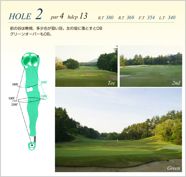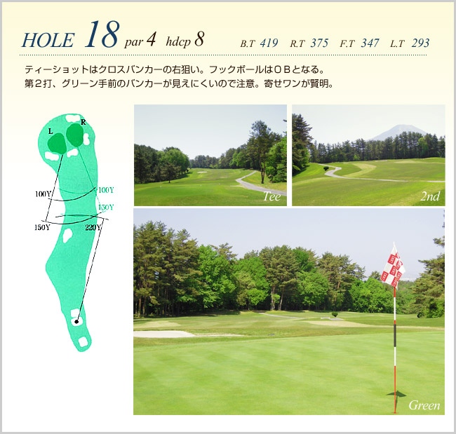 コース間には松などの原生林が多く、季節による紅葉や若葉など美しい。OBは少ないが、バンカーが要所を引き締め、長いコースをより難しくしている。ティショットの距離は必要。